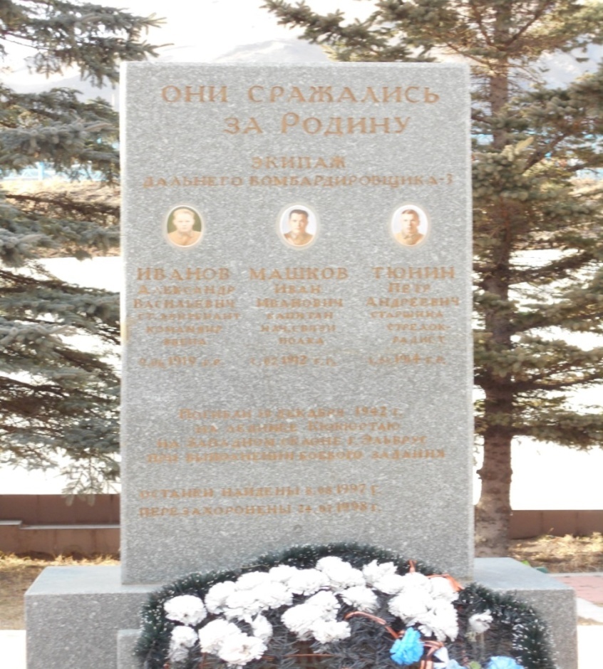Особое место среди них занимает стела, возведённая в 1998 г. над братской могилой экипажа самолёта ДБ-3, погибшего на склоне Эльбруса в годы Великой Отечественной войны. Стела из зеленого мрамора стоит на высоком постаменте. На ней надпись»Они сражались за Родину», фотографии 3 летчиков с фамилиями, званиями , датами жизни, краткая история гибели и перезахоронения экипажа. На самом постаменте стеллы установлена мемориальная доска с Указом Президента Российской Федерации от12 декабря 1998 года о присвоении старшему лейтенанту Иванову Александру Васильевичу звания Героя Российской Федерации.