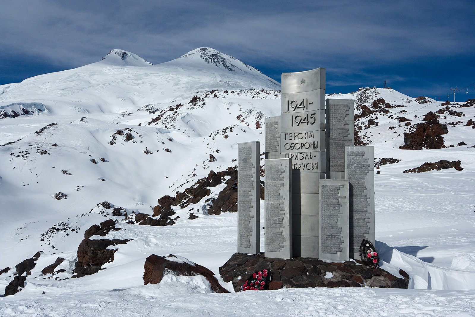 Памятник «Героям обороны Приэльбрусья» начали возводить с 1986 года и закончили через год, а торжественное открытие состоялось 9 мая. Во время Великой Отечественной Войны фашисты многократно пытались покорить вершину Эльбруса, так как верили в мистическую победу, «завоюем вершину — одержим победу в войне». Но советские солдаты — альпинисты до последнего держали оборону склонов, поэтому в боях было много погибших.